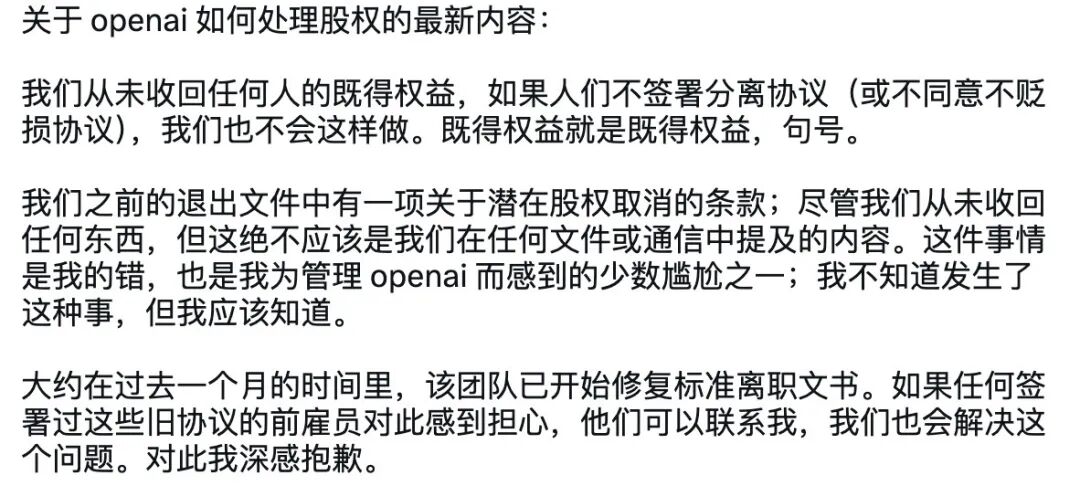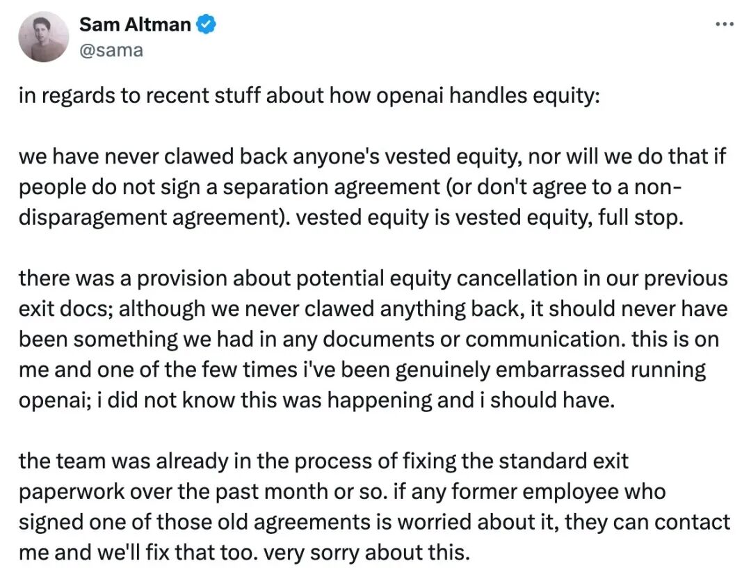 眼看事情要失控,Sam Altman 紧急发文回应。包括图灵奖得主 Yann LeCun 也加入了这场关于人类命运安全的大论战。这些回应在今天凌晨也已经发布。Altman 在回应中承认了离职协议中确实包含股权取消的条款,但实际上从未收回过股权,自己此前也并不知情,同时表示可以为前员工修正这些离职协议。每天来自四面八方的 AI 新闻如同密集的鼓点,都在持续不断地敲打我们的神经。一系列落地产品的推出传达了最朴素却深刻的道理——应用为王,落地为本。在技术的狂潮中,那些能够真正解决现实问题、服务于人类生活的应用,才是检验 AI 价值的最终标准,也让我们的思维在这场狂轰滥炸的洗礼中逐渐变得清晰。疯狂还没结束,下周的微软 Build 开发者大会,下个月的苹果 WWDC,还会带来更多惊叹,我们或许正在见证又一个科技史的转折点。![]()