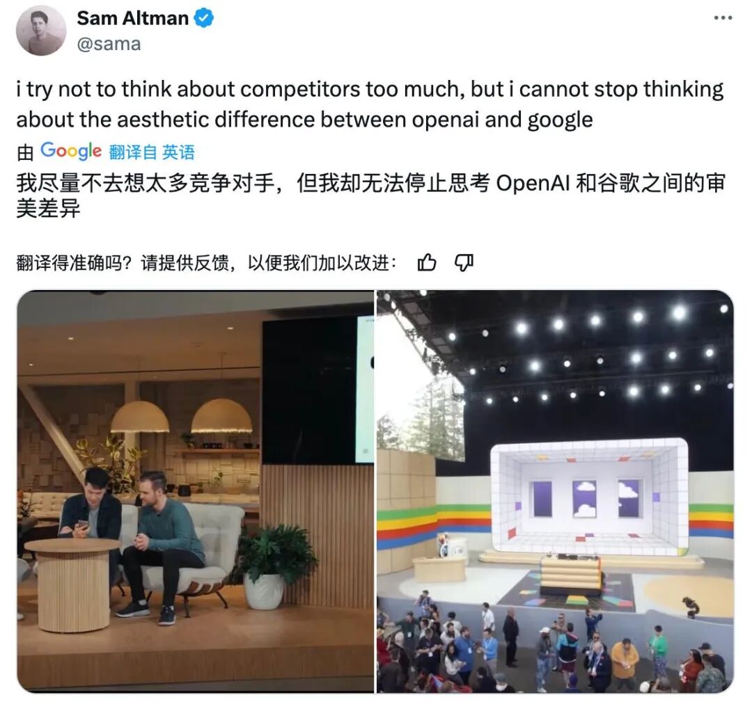 GPT-4o 前脚刚发布,后脚压力便给到了晚一天召开的 Google I/O 大会。顶着整个 AI 圈的冷嘲热讽,Google 近两个小时的暴力输出颇有些要以量取胜的味道。Project Astra 对轰 GPT-4o,打造通用 AI 助手;Veo 模型对标 Sora,支持生成 60 秒 1080p 规格视频;Google Search AI 加强 AI 搜索概要功能;Imagen 3 创建逼真的画像;Gemini 1.5 Pro 支持 2M 上下文窗口……老大哥 Google 在和 OpenAI 的同场竞技中,整体的路数显得有些局促谨慎。例如,在实际的演示过程中,GPT-4o 是实时进行的,而 Project Astra 为了避免出错仅仅放出录制的视频,生怕自家的股价重蹈覆辙,再次上演一夜闪崩。又或者,同样采用女声,两个语音助手在「性格」上也截然不同。GPT-4o 加持下的 AI 语音助手主打的就是幽默风趣,力求做到比人更像人,仿佛电影《Her》里的萨曼莎走入现实。而雷厉风行的 Project Astra 则更务实,专注于解决实际的任务,甚至在 Google 介绍 Astra 时,用到最频繁的词汇就是「助理」,这实际上也反映了两家企业对于语音助手的不同定位。如果产品的较量还只是潜藏于水面之下的激流,那么 OpenAI CEO Sam Altman 发布的推文则将「矛盾」摆在了明面上:我尽量不去想太多竞争对手,但我却无法停止思考 OpenAI 和 Google 之间的审美差异