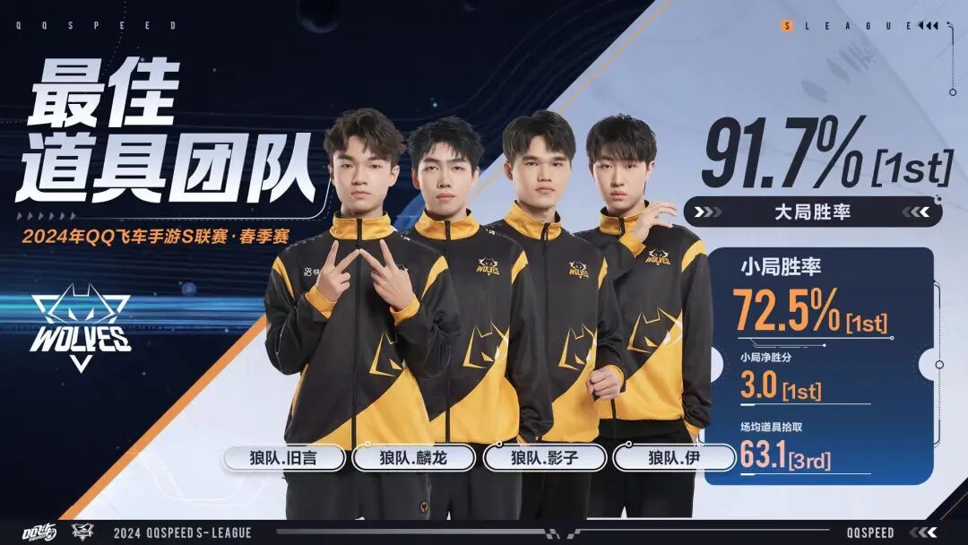 恭喜狼队道具组在2024年S联赛春季赛常规赛中默契配合完美运营,如同烈风般势不可挡,荣获2024年S联赛春季赛常规赛最佳道具团队的称号!