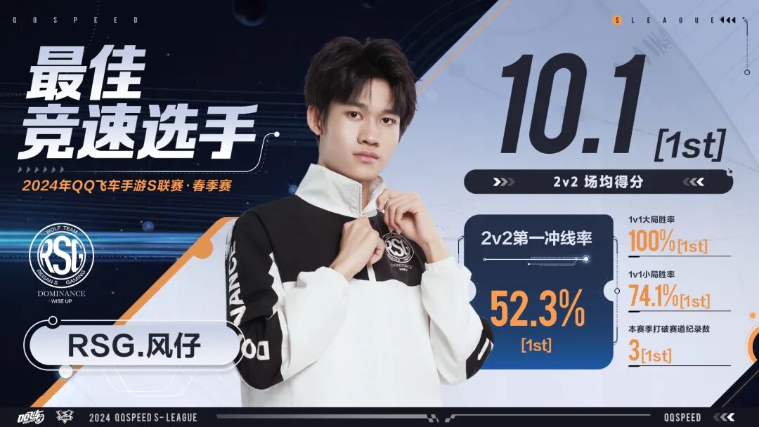 恭喜RSG.风仔在2024年S联赛春季赛常规赛中,以一往无前的姿态御风而行,成功获得2024年S联赛春季赛常规赛最佳竞速选手的称号!