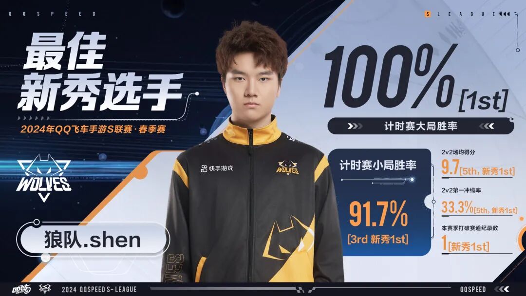 恭喜狼队.shen在2024年S联赛春季赛常规赛中以初生牛犊不怕虎的锋锐,神勇发挥,荣获2024年S联赛春季赛常规赛最佳新秀选手的称号!