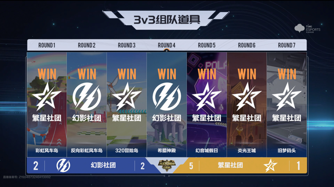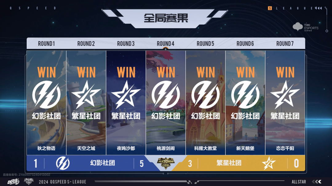 精彩对战拉开帷幕,四位新秀幻影.最、幻影.不朽、繁星.阿峰、繁星.Peng与社长齐上阵,双方你来我往,在组队道具赛和组队竞速赛的双模式轮换中互不相让,四局过后未分胜负。随后幻影社团连拿两分,率先开启赛点。第七局恋恋千阳,两位社长在前方领跑,繁星.风仔领跑失误,繁星.阿峰迅速补位,扳回一分。第八局繁星.Peng被酷比和龙卷风击中,幻影.最完成冲线,幻影社团以5:3的比分拿下序列全能赛的胜利。