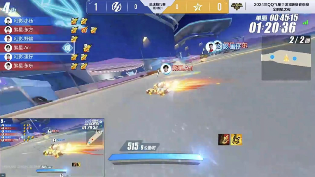 来到第二项星速技巧赛考核,前两局繁星.Ani和幻影.蛋仔担起花式漂移重任,其余四位选手则全力向前,幻影.蛋仔完成度较高,社团总评分更高,赢下2分。