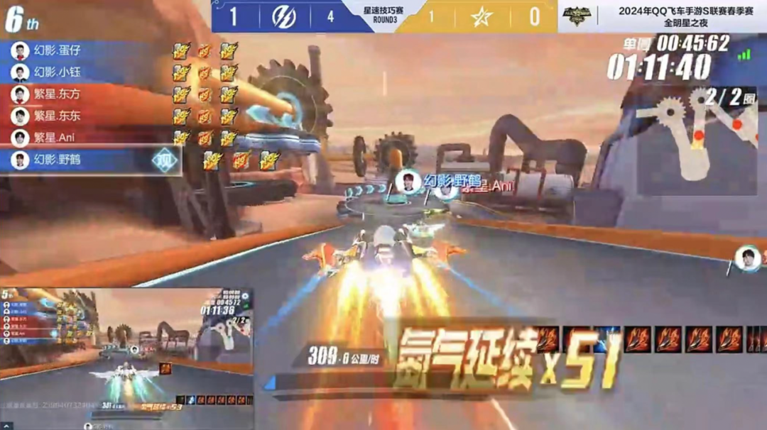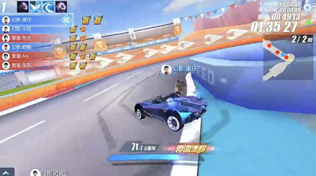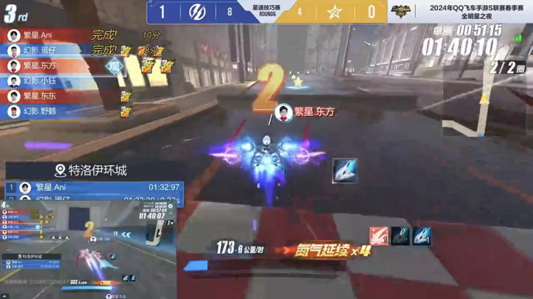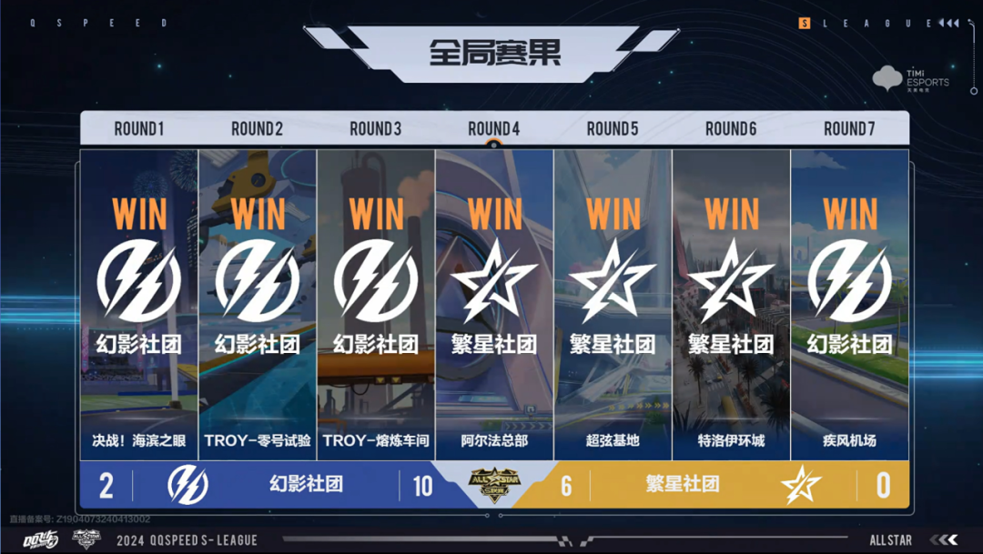 之后两局双方均达成氮气延续50次的花式漂移要求,各拿一分。第六局繁星.东方极限卡点完成漂移展示拿下得分。第七局疾风机场,双方卡位激烈,技巧展示均受阻,幻影社团率先冲线,最终七局比赛过后幻影社团拿到本轮比赛胜利。