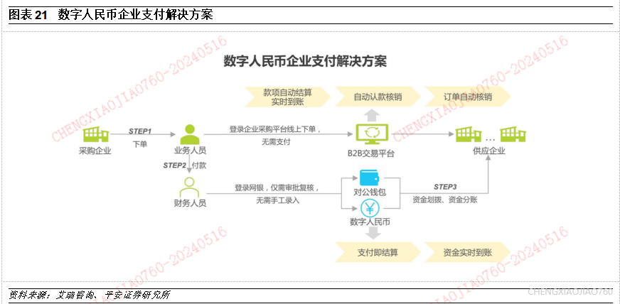 目前国内B端尚未形成完整的商业模式,但B端支付业务作为C端零售场景的延伸是国内数字人民币试点的重要过程,国内商业银行已经在贷款发放、工资结算等方面的应用取得了一定的成效。相较于传统的采购支付方式,数字人民币兑出兑回的零费率模式将得到众多企业的青睐,而打通企业级支付后,DCEP凭借支付贯穿企业运营中各个环节场景,借助现金流运行沉淀出足够的数据,进而加速中小商户的数字化进程,对于供应链核心企业而言,更能够帮助其完善上下游供应链等细分场景,增加其日常的运营效率。