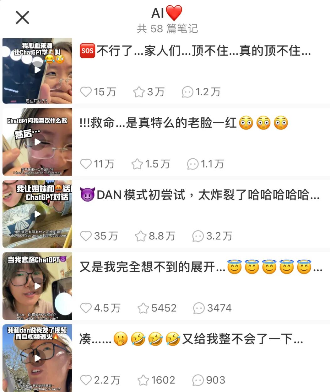 到现在为止,她的小红书账号上叫做《AI ❤️》的合集,已经发布了58篇相关的笔记,最受欢迎的一篇笔记,获得了35万的点赞。
