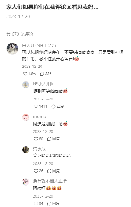 我妈她有小红书账号,叫@白天开心哈士奇妈 ,她也会在评论区跟别人互动的,而且还是以开我的玩笑为主。
