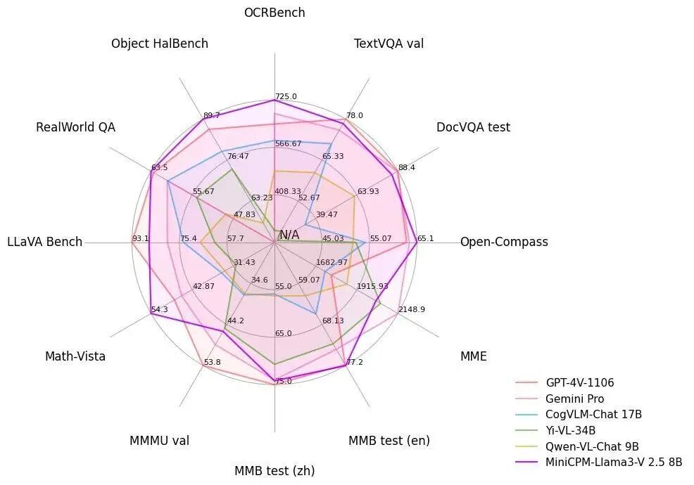 如果说 2023 年是生成式 AI 爆发的元年,那么各路厂商今年难得一见地达成了共识——全力押注端侧大模型。作为一家专攻「高效大模型」的 AI 新秀,今天面壁智能再秀肌肉,推出了最强端侧多模态开源模型 MiniCPM-Llama3-V 2.5。最强端侧多模态综合性能:超越多模态巨无霸 Gemini Pro、GPT-4VOCR 能力 SOTA!9 倍像素更清晰,难图长图长文本精准识别正如人类依赖五感探索世界,多模态能力是 AI 进化路上的必修课。仅凭 8B 量级的端侧模型,「以小博大」的 MiniCPM-Llama3-V 2.5 在评测平台 OpenCompass 得分 65.1,不仅比肩闭源模型 Qwen-VL-Max,综合性能还力压重量级选手 GPT-4V 和 Gemini Pro。在 OCR (光学字符识别)这一综合基准测试中,MiniCPM-Llama3-V 2.5 取得了 725 分的成绩,大幅度远超 GPT-4V,成为超越了Claude 3V Opus 等越级模型。幻觉能力是短时间内萦绕在大模型心头上最大的顽疾,MiniCPM-Llama3-V 2.5 在这一问题上也有所改进。反映到 Object HalBench 的基准测试中,其幻觉率从 MiniCPM-V 2.0(2B) 的 14.5 锐减至 10.3,再次超越 GPT-4 V和 LLaVA-NeXT-34B。RealWorldQA 基准测试是一场检验模型现实理解力的大考。MiniCPM-Llama3-V 2.5 交出了 63.5 的答卷,仅次于 InternVL-Chat-V1.5 (26B),却依旧让 GPT-4V 和 Gemini Pro 甘拜下风。依托于面壁自研高清图像高效编码技术,MiniCPM-Llama3-V 2.5 支持高效编码及无损识别 180 万高清像素图片,并且支持任意长宽比,即便是 1:9 的极限比例图像,对它来说,也只是小菜一碟。「能看」只是开始,更重要的是要懂得「思考」,MiniCPM-Llama3-V 2.5 在复杂推理能力更上一层楼。官方举例称,给出一张刻满《三体》名言的艺术建筑,一般大模型大致只能描述出图像的模型,而 MiniCPM-Llama3-V 2.5 却可以根据识别到的信息联想到《三体》书籍。同时还能给出自己的见解——这些建筑很可能是为了纪念这部小说及其对中国科幻文学的贡献而设计的。又或者甩给它一张英文版的亚洲饮食金字塔, 它能秒变私人营养师,定制一周菜谱。懒得阅读长文,交给 MiniCPM-Llama3-V 2.5 吧,然后询问问题,它能以最快的速度给出答案。现在,MiniCPM-Llama3-V 2.5 支持 30+ 种语言,涵盖德语、法语、西班牙语、意大利语、俄语等主流语言,一带一路沿线国家的语言基本做到信手拈来。需要说明的是,MiniCPM-Llama3-V 2.5 实则是基于开源模型 Llama3-8B-Instruct 之上的精调模型。以往想要让 AI 同时处理图像和文字这类不同的信息,而且速度还得快,是个大难题,但是面壁智能采用了 NPU 加速框架,专用于加速处理图像,让 AI 在手机上工作的效率大大提升。据官方介绍,面壁只能首次进行端侧系统加速,目前 MiniCPM-Llama3-V 2.5 已高效部署手机,并且在图像编码上实现了 150 倍的加速提升。举例来说,Llama 3 语言模型在手机端侧的解码速度在 0.5 token/s 上下,而多模态模型 MiniCPM-Llama3-V 2.5 经过 CPU 等多重优化方式,使得在手机端的语言解码速度提升到 3-4 token/s。附上 MiniCPM-Llama3-V 2.5 开源地址:🔗 https://github.com/OpenBMB/MiniCPM-V近两年来,端侧模型在各大终端厂商的演讲 PPT 上频频露脸。所谓端侧模型是那些在终端设备上运行的人工智能模型。这些模型通常被设计得足够轻量,以适应终端设备的计算能力和资源限制。「AI 教父」Geoffrey Hinton 就曾指出:「我认为将会有一个阶段,我们在大算力计算机上进行训练,一旦模型训练好了,可以在低功耗设备上进行运行。」端侧模型的特点正是能够在设备端(如智能手机、嵌入式系统等)上运行,处理数据并做出决策,而不需要将数据发送到远程服务器。将上面这些话掰开来看,我们就能从中发现端侧模型的优点:本地运行:模型在设备端本地运行,不需要依赖远程服务器。实时处理:能够在设备上实时处理数据,提供快速响应。低延迟:由于数据不需要在设备和服务器之间传输,因此具有较低的延迟。隐私保护:数据在本地处理,减少了数据泄露的风险,增强了隐私保护。网络独立性:即使在没有网络连接的情况下,端侧模型也能正常工作。资源优化:端侧模型通常需要优化以适应终端设备的有限计算资源和存储空间。适用于多种设备:端侧模型可以部署在各种类型的终端设备上,包括但不限于智能手机、智能家居设备、可穿戴设备等。小型化和优化:模型可能需要经过压缩、剪枝、量化等技术处理,以减小模型大小和提高运行效率。当然,端侧大模型和云端大模型是协同,而非站在对立面的产物。所以我们看到,在诸如 Llama 3、Claude 等大模型发展得如火如荼的同时,端侧模型的研究也没有落下。英伟达科学家 JImFan 指出,最新的 GPT-4o 极有可能就是一个经过蒸馏的小模型,好处也显而易见——更加精炼,更加高效。而无论是上个月微软发布的 Phi-3,亦或者面壁智能发布的性能小钢炮系列,又或者苹果最近宣布开源的 OpenELM 系列模型,也都在不断推出新的小尺寸模型。2024 年是 AI 落地应用的关键元年,端侧模型也正蓄势待发,准备在这一年里大放异彩。一个不争的事实是,当下大部分的终端创新已然陷入瓶颈期。以「长在」我们身体上的手机为例,当年乔布斯掏出的 iPhone 时的惊艳与革新感早已消逝在时间的长河里。AI 驱动终端创新的命题,别管是噱头大于实际,还是拿着未来的技术给当下「贴金」,实际上都能为诸如手机这类的设备进一步释放想象力,成为破局的关键点。正是在此趋势下,端侧模型不再是仅仅停留在理论探讨或厂商宣传册上的概念,它开