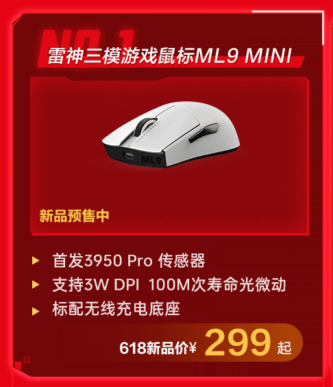 最高支持3W DPI配备,拥有100M次寿命的光微动!按键盖有独家定制的预压系统,支持星闪连接最高可到8K轮训率,内置600mAh大电池并标配无线充电底座,在外观方面,除标准版白色外,同时上架的还有永劫无间定制款以及雷神十周年橙色定制版,满足高颜值需求的你,现已开启预售!