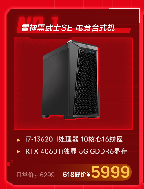 有些小伙伴们使用电脑的场景比较固定,想要选购一台台式机来当作自己的主力机,那么这台全新推出的雷神黑武士SE 电竞台式机是个不错的选择!搭载酷睿i7-13620H处理器+RTX 4060Ti 显卡,拥有8G GDDR6显存,无论是性能还是价格都十分具有竞争力!