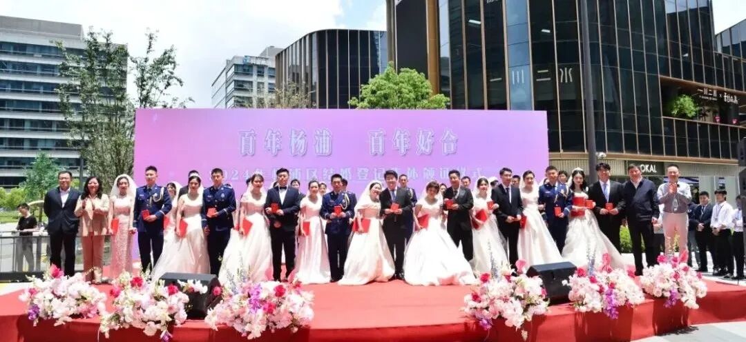 杨浦区民政局联合区委老干部局共同打造“百年杨浦、百年好合”婚姻文化品牌,举办“百年杨浦、百年好合”——2024年杨浦区结婚登记集体颁证仪式,并成立了“幸福婚姻”导师团,交流传授经营家庭的技巧和方法,为新人们开启幸福生活的“密钥”,以“夕阳红”映照“幸福红”。