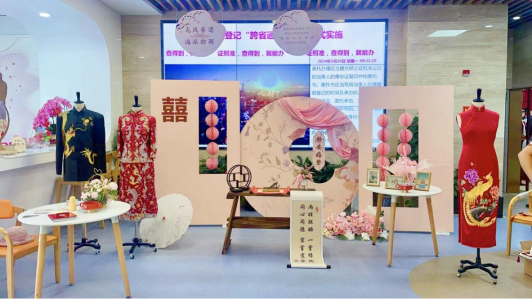 静安区婚姻登记中心推出“龙凤旗袍”非遗文化展示活动,开展“美丽静安 幸福启航”结婚登记主题颁证活动,邀请国家级非物质文化遗产传承人、“静安工匠”的荣获者作为特邀颁证师,向新人们展示龙凤扣绳记的现场制作过程,使文化传承和甜蜜业态创新交融。