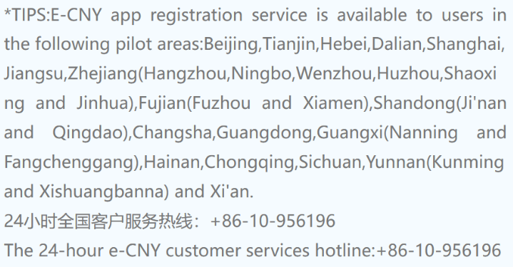 *注:数字人民币App可在如下试点地区注册使用:北京,天津,河北,大连,上海,江苏,浙江(杭州、宁波、温州、湖州、绍兴、金华),福建(福州、厦门),山东(济南、青岛),长沙,广东,广西(南宁、防城港),海南,重庆,四川,云南(昆明、西双版纳),西安。