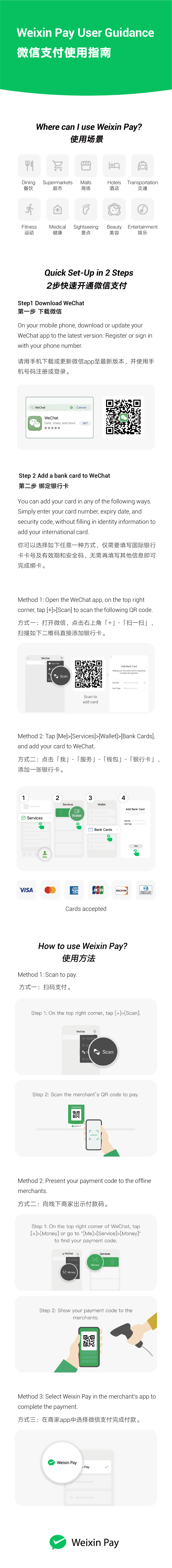 Mobile payment with UnionPay, Alipay, Weixin Pay and some of overseas e-wallets is more than welcomed.