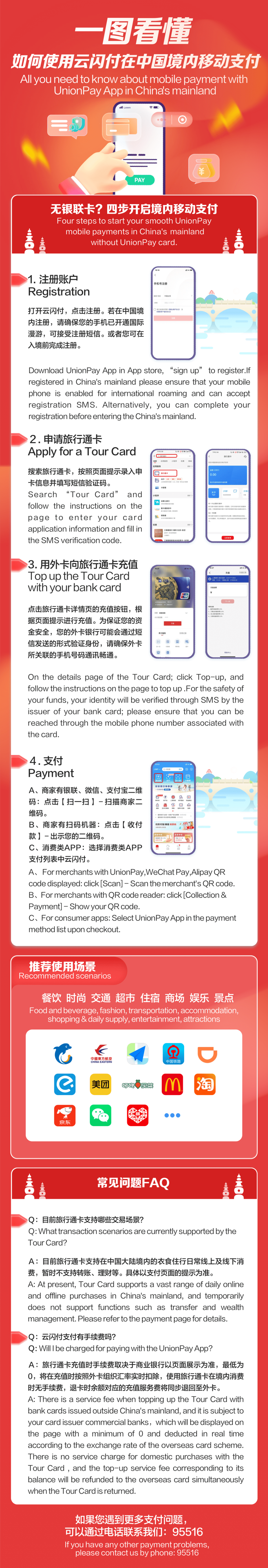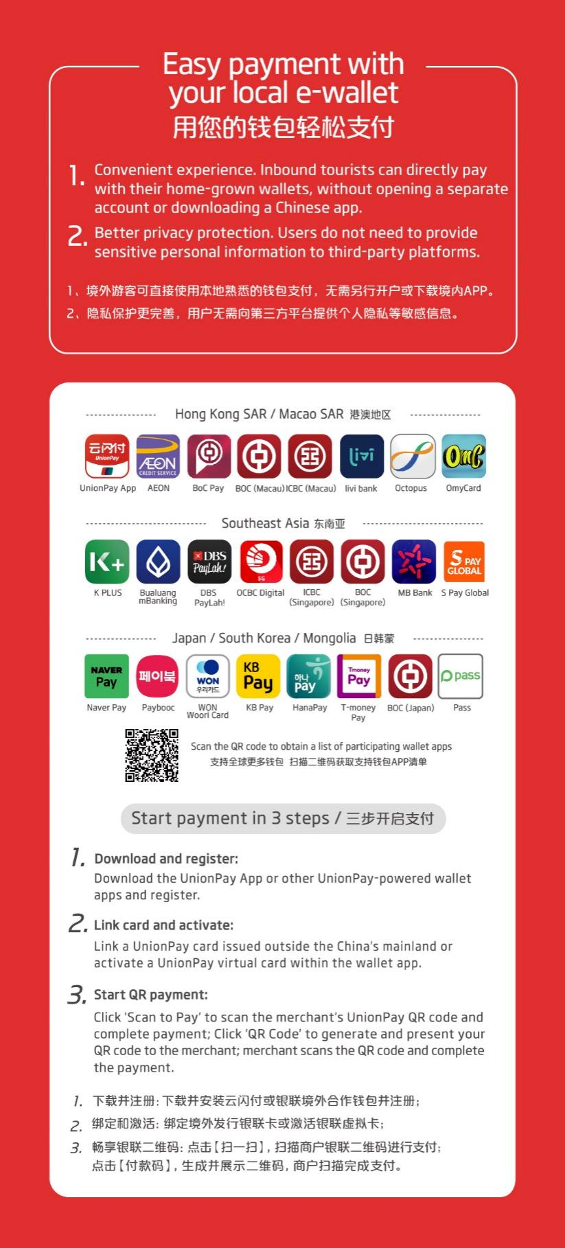 If you already have a UnionPay-powered overseas e-wallet, you can directly scan and pay at UnionPay standard OR code merchants, local e-wallet app is not required.