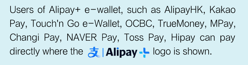 AlipayHK, Kakao Pay, Touch'n Go e-Wallet, OCBC, True-Money, MPay, Changi Pay, NAVER Pay, Toss Pay, Hipay或其他Alipay+合作的电子钱包用户,见到Alipay+标识,您可使用该电子钱包进行支付。