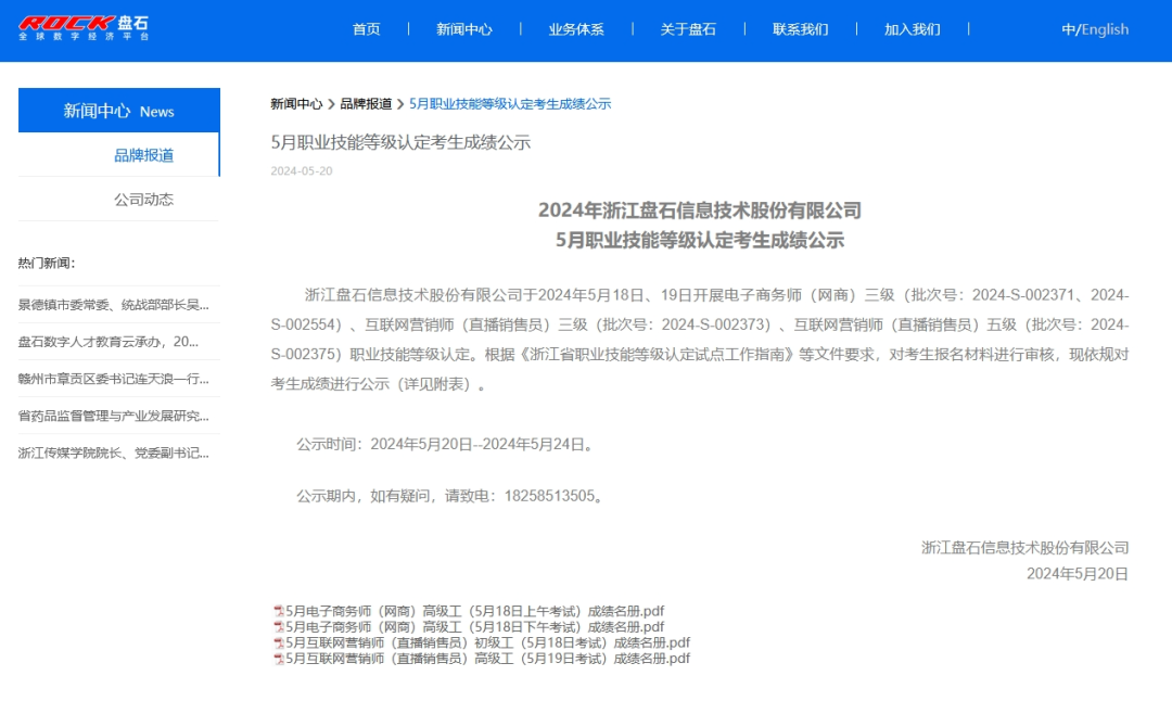 浙江盘石信息技术股份有限公司于2024年5月18日、19日开展电子商务师(网商)三级(批次号:2024-S-002371、2024-S-002554)、互联网营销师(直播销售员)三级(批次号:2024-S-002373)、互联网营销师(直播销售员)五级(批次号:2024-S-002375)职业技能等级认定。根据《浙江省职业技能等级认定试点工作指南》等文件要求,对考生报名材料进行审核,现依规对考生成绩进行公示。