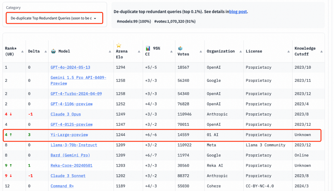 值得一提的是,为了提高 Chatbot Arena 查询的整体质量,LMSYS 还实施了重复数据删除机制,并出具了去除冗余查询后的榜单。这个新机制旨在消除过度冗余的用户提示,如过度重复的 “你好”。这类冗余提示可能会影响排行榜的准确性。LMSYS 公开表示,去除冗余查询后的榜单将在后续成为默认榜单。在去除冗余查询后的总榜中, Yi-Large 的 Elo 得分更进一步,与 Claude 3 Opus、GPT-4-0125-preview 并列第四。![]()