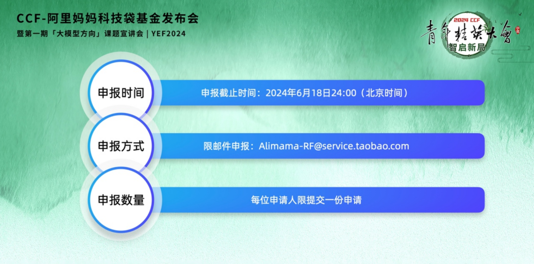摘要:YEF 2024期间,CCF联合阿里妈妈正式发布「CCF-阿里妈妈科技袋基金」, 第一期聚焦大模型方向,申报截止时间:2024年6月18日24:00(北京时间),欢迎CCF会员积极申报。