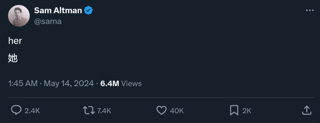 此前,OpenAI CEO Altman 还在社交平台上神秘地留下一句「her」,似乎也在暗示 ChatGPT 实现了这部电影中的场景。![]()