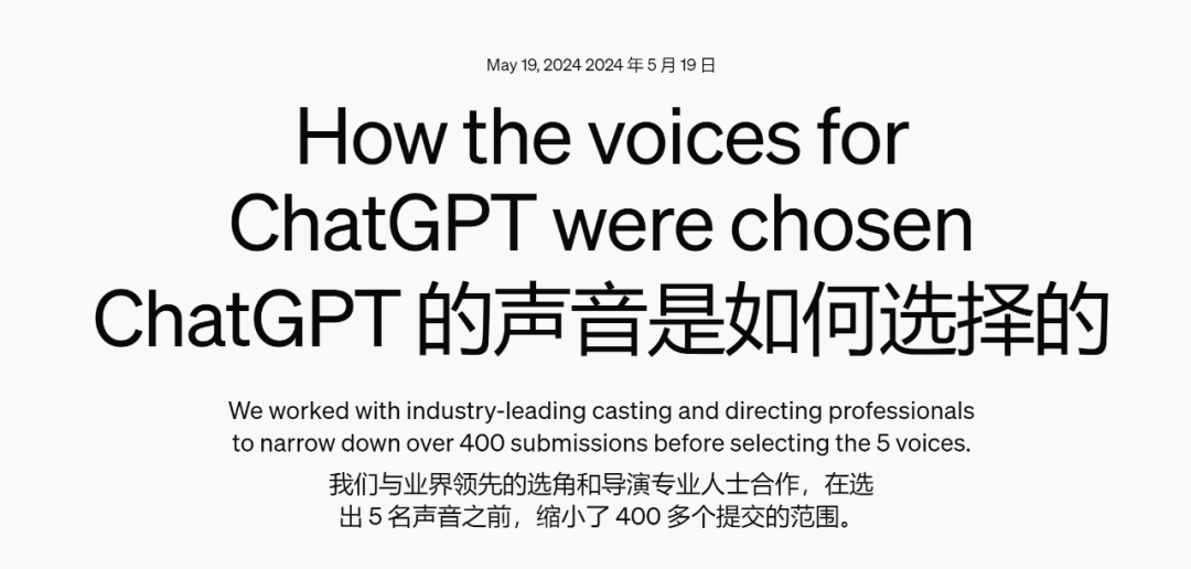 OpenAI发布的声明博客。来源:https://openai.com/index/how-the-voices-for-chatgpt-were-chosen/