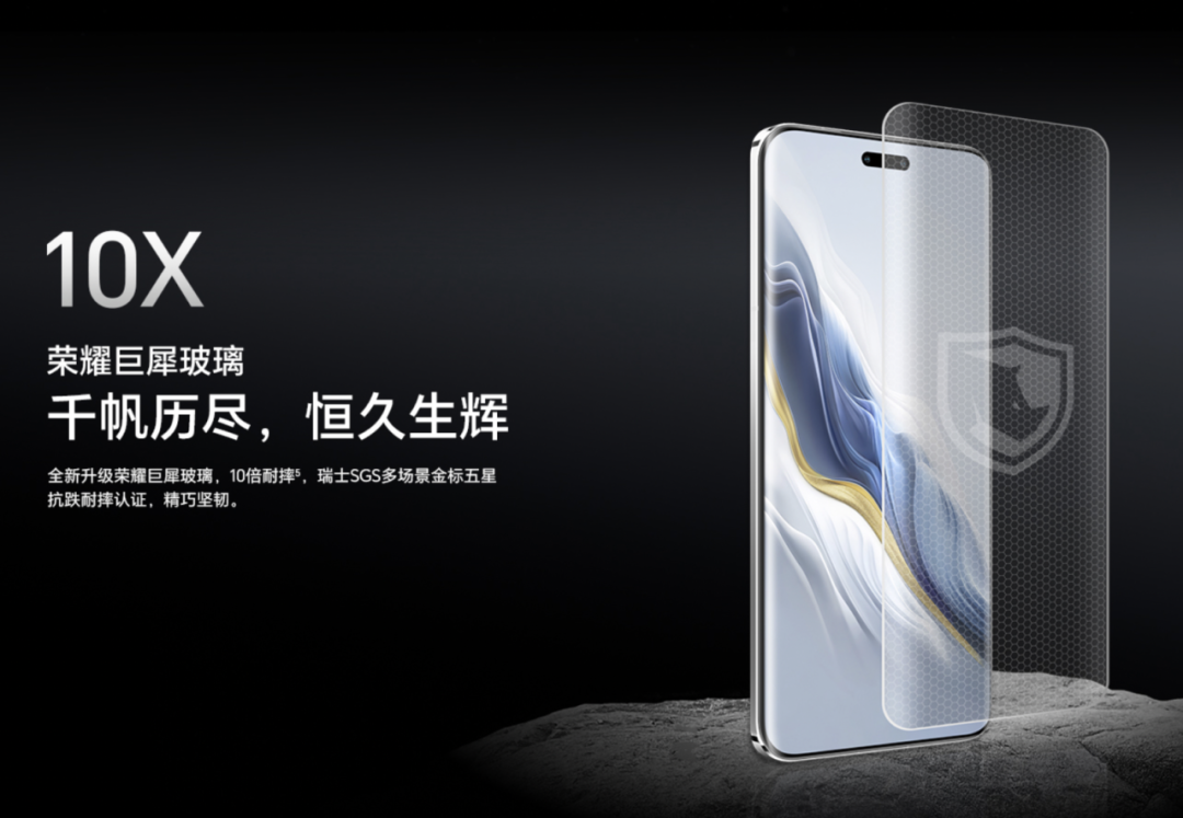 荣耀Magic6系列全系搭载荣耀巨犀玻璃,优化的材料配方让晶体密度提升50%,通过瑞士SGS多场景金标五星抗跌耐摔认证,在大理石、柏油路面、砂石路面等恶劣场景下,依旧抗跌。