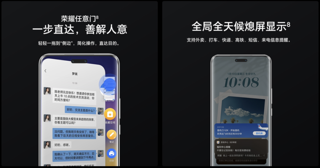 如全新标志性的交互功能“任意门”,基于荣耀端侧平台级AI大模型的数据化学习和个性化习惯,通过感知中台,基于多模决策引擎,让各种跨应用操作,轻轻一拖、直达需求,实现突破性的操作体验升级。