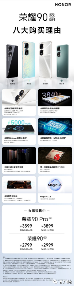 全新一代数字系列手机荣耀90系列,美,自然上镜!2亿像素写真相机,全系搭载2亿像素超清大底主摄,以及1200万像素超广角微距镜头,荣耀90 Pro还搭载了3200万像素长焦人像镜头,前置5000万像素写真人像双摄,同时荣耀90系列首发3840Hz PWM零风险调光护眼屏且获得德国莱茵TÜV认证,同时加持类自然光护眼、助眠显示等功能,亮眼更护眼;荣耀90 Pro搭载了第一代骁龙8+旗舰芯片,性能大幅提升;搭配悬浮流线四曲屏,轻约192g薄至约8.1mm,5000mAh大电池,兼顾续航与手感,带来高性能使用体验。6月7日全渠道火热开售,2799元起,欢迎下单体验!