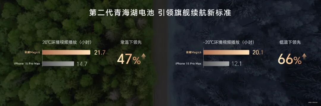 第二代青海湖电池技术,以及全新的自研能效增强芯片HONOR E1和荣耀都江堰电源管理系统,使荣耀Magic6的电池容量达到5450mAh,荣耀Magic6 Pro电池容量更是高达5600mAh,成就旗舰产品中领先的续航能力。荣耀Magic6系列在低温、低电量情况下的综合续航能力也大幅提升,实现了行业低温续航技术的新突破,让用户在恶劣环境、极限场景下,可以有更多的机会用手机与他人联络或处理紧急情况。