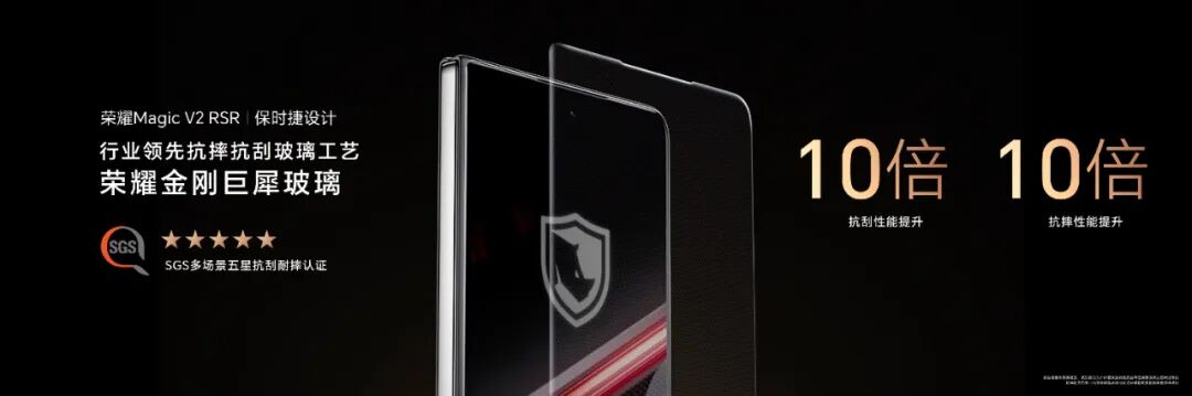 作为全球首款保时捷设计折叠屏手机,荣耀Magic V2 RSR保时捷设计重量仅为234克、闭合态厚度仅为9.9毫米。在产品外屏上,荣耀带来行业首发的荣耀金刚巨犀玻璃。荣耀在超跑引擎上发现了一种超耐磨材料——氮化硅,借助氮化硅镀晶,屏幕的抗刮性能大大增加,为手机提供增强的保护。