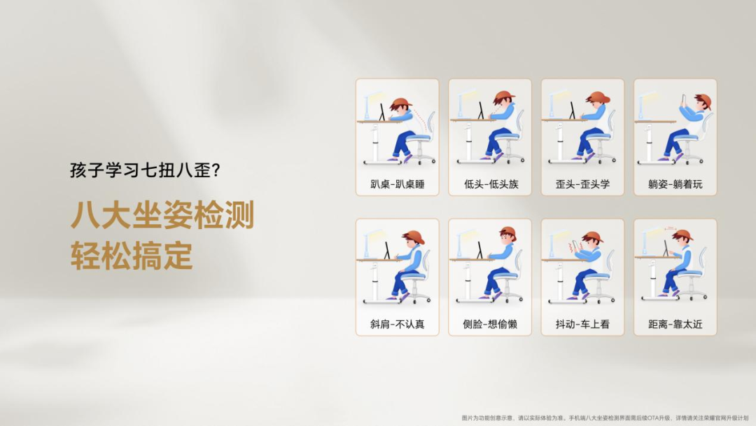 在使用电子设备时,不正确的坐姿会导致孩子出现近视、脊柱侧弯等问题。为此,荣耀平板9全新升级八大坐姿检测,支持趴桌、低头、歪头、躺姿、斜肩、侧脸、抖动、距离提醒,当孩子坐姿不端时,系统会提醒孩子端正坐姿,及时纠正不良习惯,培养孩子健康体态。