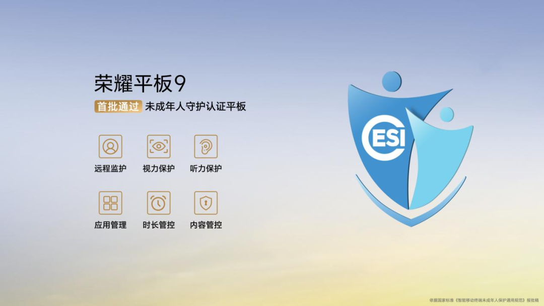 除了实现护眼再进化,荣耀还和中国电子技术标准化研究院达成了深度合作,积极参与电子设备未成年人守护认证的标准拟定,时刻关注未成年人的身心健康。荣耀平板9也成为了行业首批通过未成年人守护认证的平板产品,针对时长管控、应用管理、内容管控、远程监护、视力保护、听力保护六大维度,定义了行业标准,普及未成年人健康使用平板新规范。