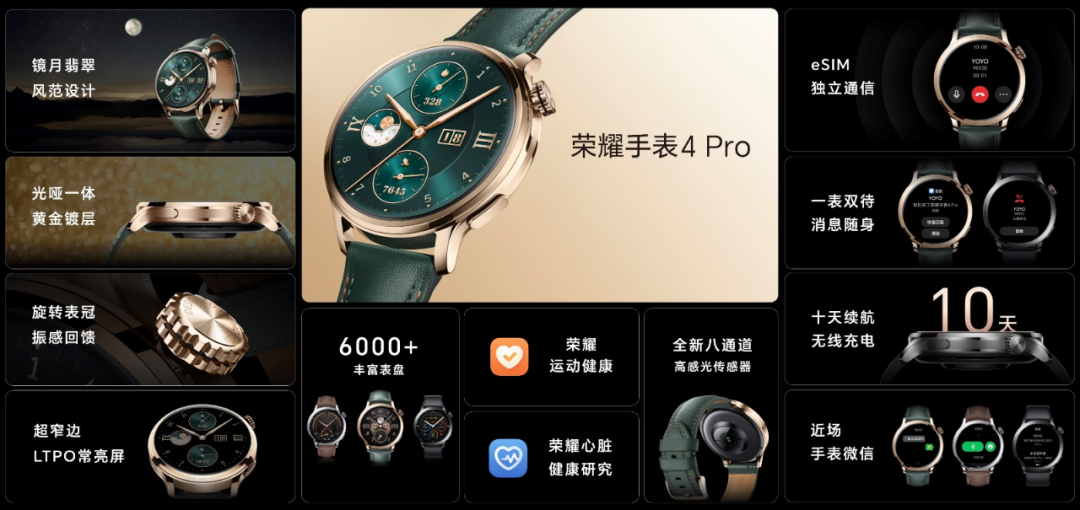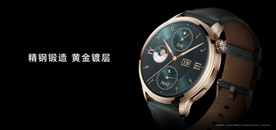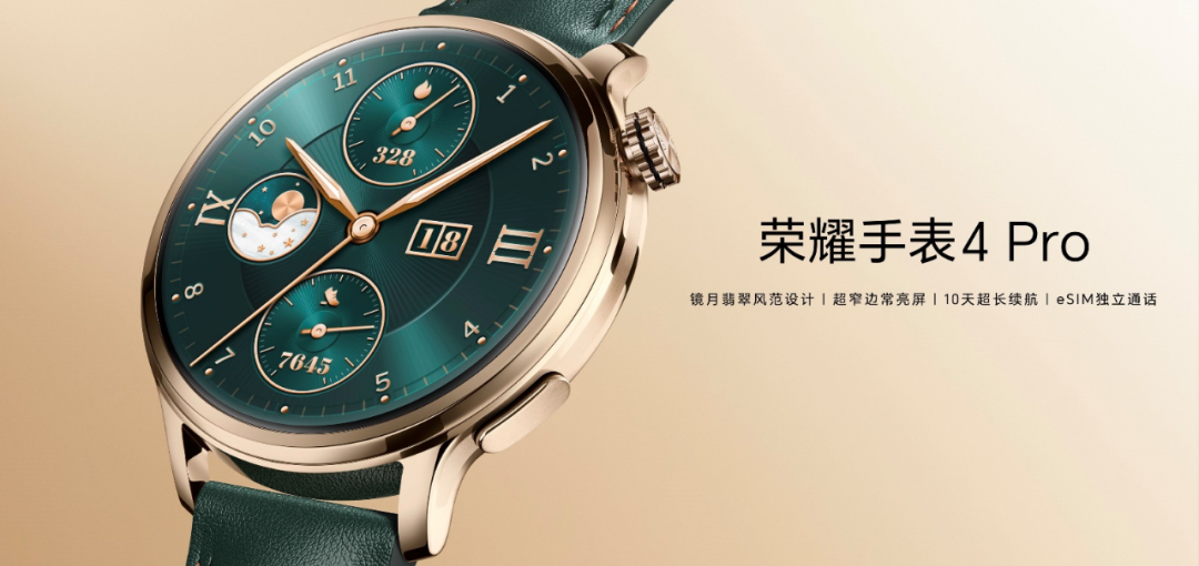 致敬传统腕表百年的设计风范、传承经典产品的多种工艺精华,荣耀手表4 Pro墨绿色表款将传统风格与现代时尚融为一体,打造出品牌独创的“镜月翡翠”风范设计,并以此命名。荣耀手表4 Pro镜月翡翠款采用经典机械风格表盘,透过表镜可以看到细致的刻度和指针,彰显出复古的优雅;表体采用奢华的精钢锻造,线条简约利落,黄金镀层工艺精心打磨,演绎了更加时尚亮丽的色泽,璀璨出众,以其独特的美感展现了智慧科技的魅力与优雅。