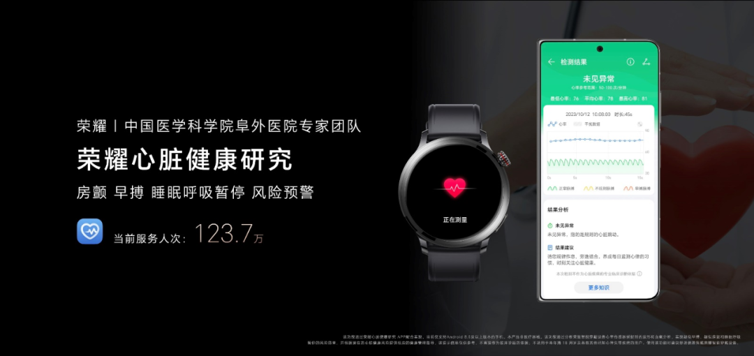 荣耀还与国内顶尖的心内科医院中国医学科学院阜外医院合作,通过持续研发的高精度算法引擎,能够实现疑似房颤、疑似早搏、疑似睡眠呼吸暂停的风险筛查提醒,为用户的心脏健康筑起第一道防线。荣耀手表4 Pro还支持全天候血氧监测、科学睡眠监测、高精度卡路里监测等等全面的健康监测功能。