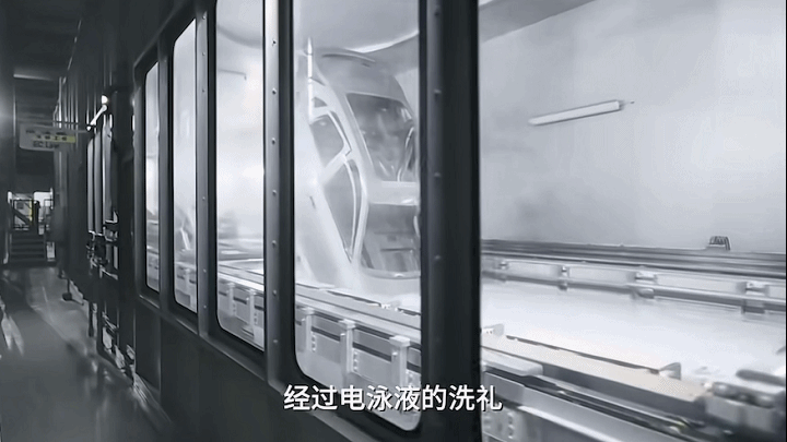 车身框架焊接完成后,就进入了涂装车间,在这里,它们需要在电泳液中全身浸泡,同时经过三层喷漆两次烘烤,变得更加防锈、抗腐蚀、抗石击。