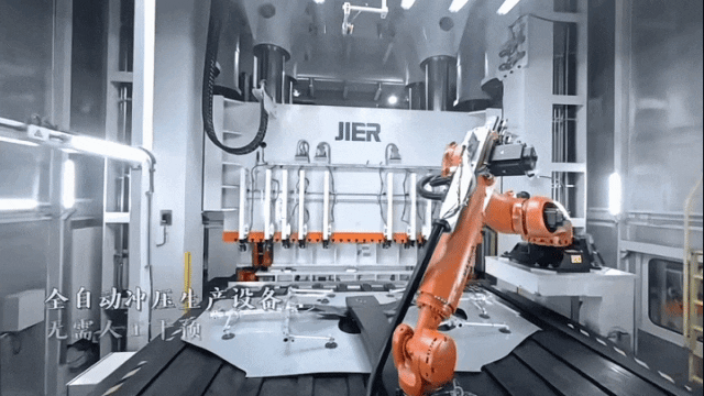全程由机械臂控制,机械臂会先将钢板放到冲压机上,利用模具瞬间江能将钢板变成车门的样子,然后再由机械臂吸走,整个环节只需要一个人进行操控,而且只需要一键启动,剩下的交给机器全程自动控制。