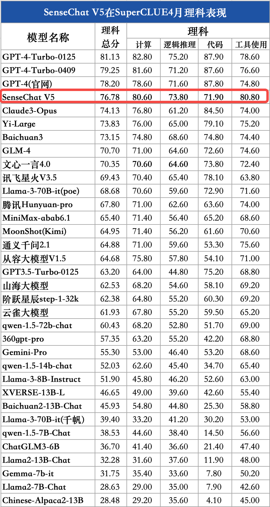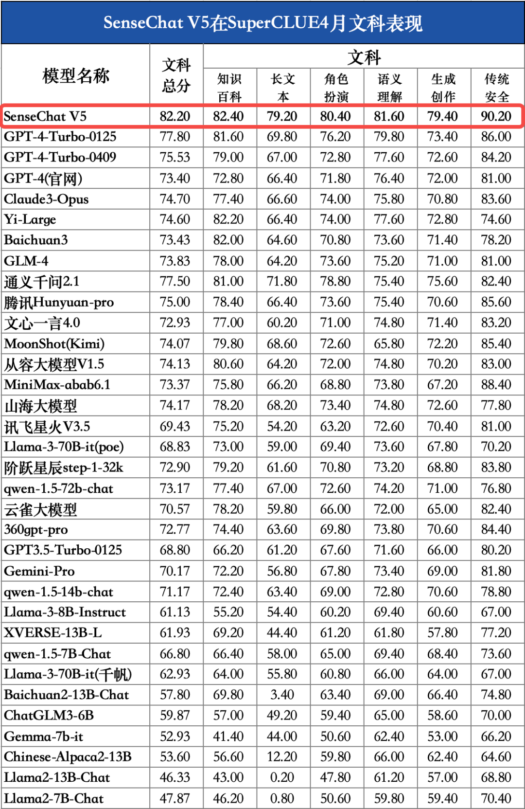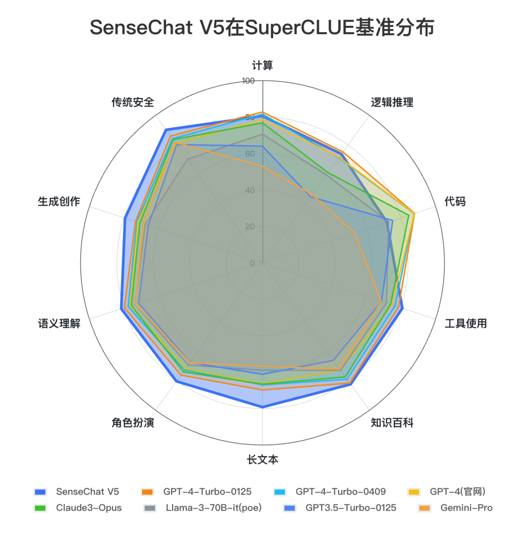 SuperCLUE团队于5月11日受商汤科技官方邀请,对SenseChat V5在SuperCLUE通用大模型综合性中文测评基准上,进行了全方位综合性测评。