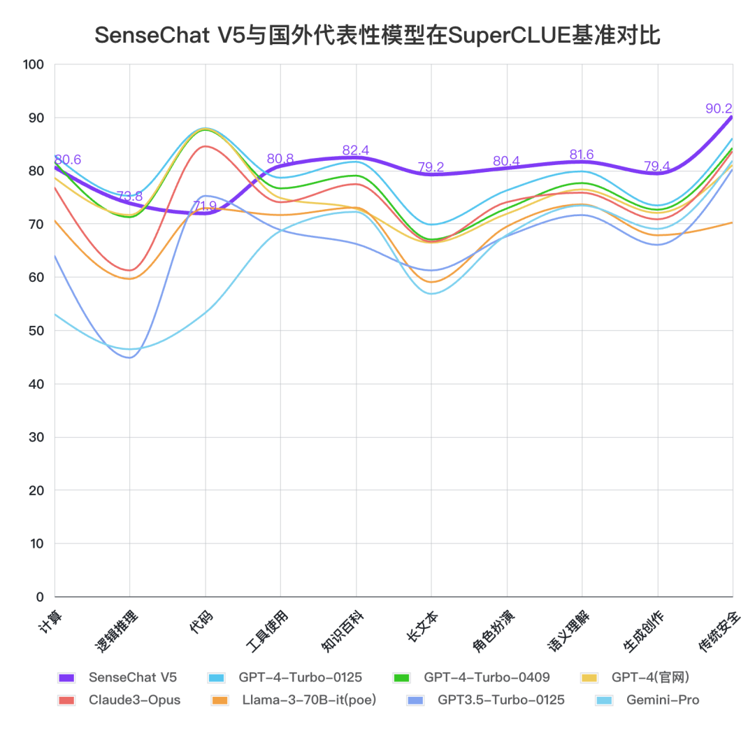 在SuperCLUE通用综合测评基准上,SenseChat V5取得80.03分,表现出色,刷新国内大模型最好成绩。并且,SenseChat V5在中文综合能力上较GPT-4-Turbo-0125高0.9分。