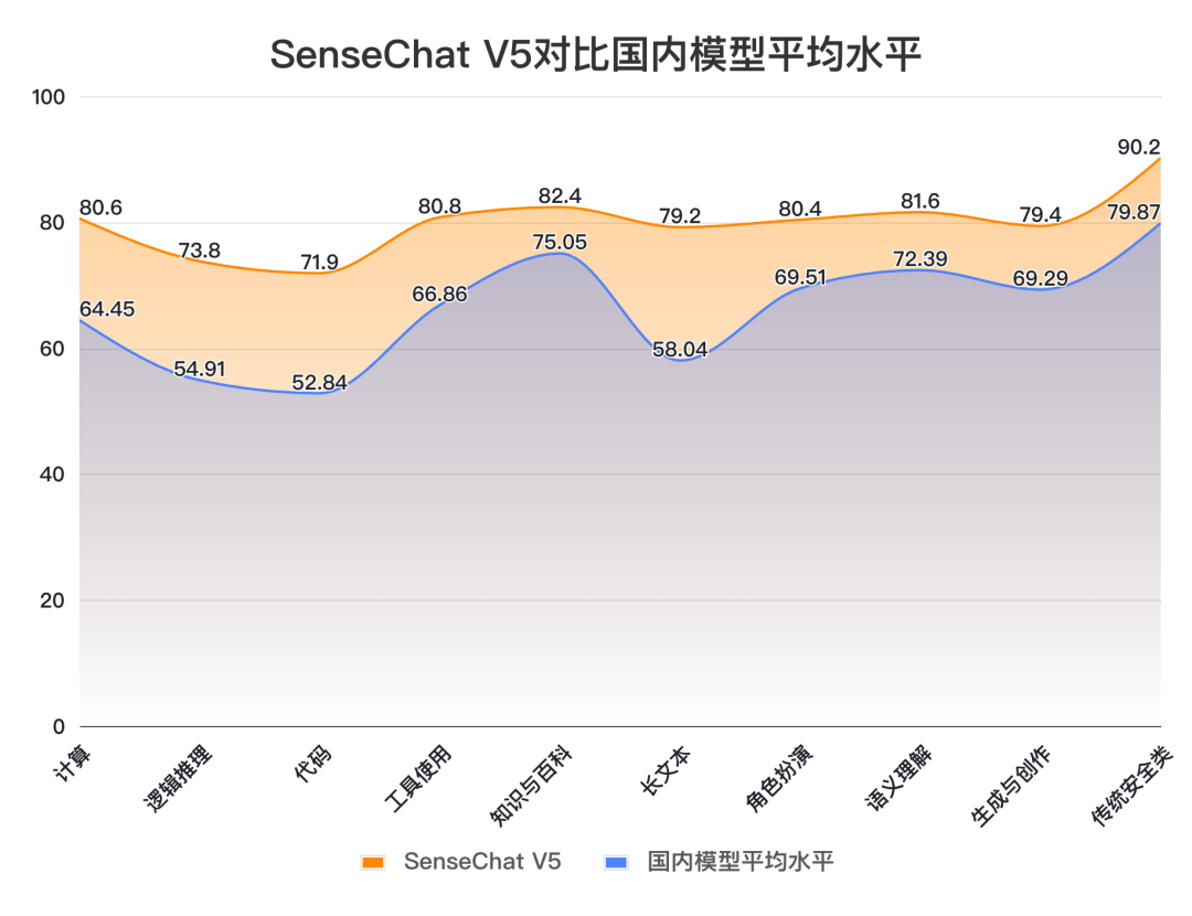 将SenseChat V5与国内大模型平均得分对比,我们可以发现,SenseChat V5在所有能力上均高于平均线,展现出较均衡的综合能力。尤其在计算(+16.15)、逻辑推理(+18.89)、代码(+19.06)、长文本(+21.16)能力上远高出平均线15分以上。