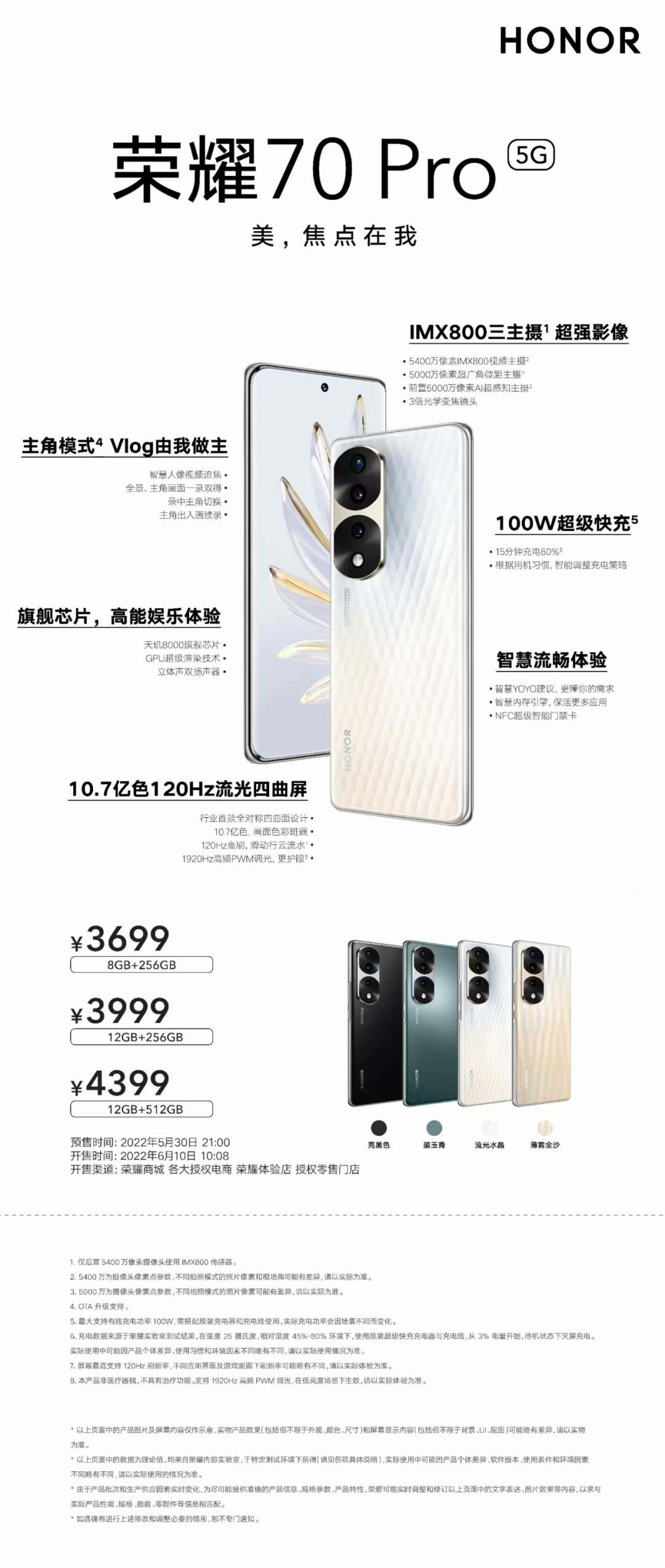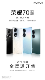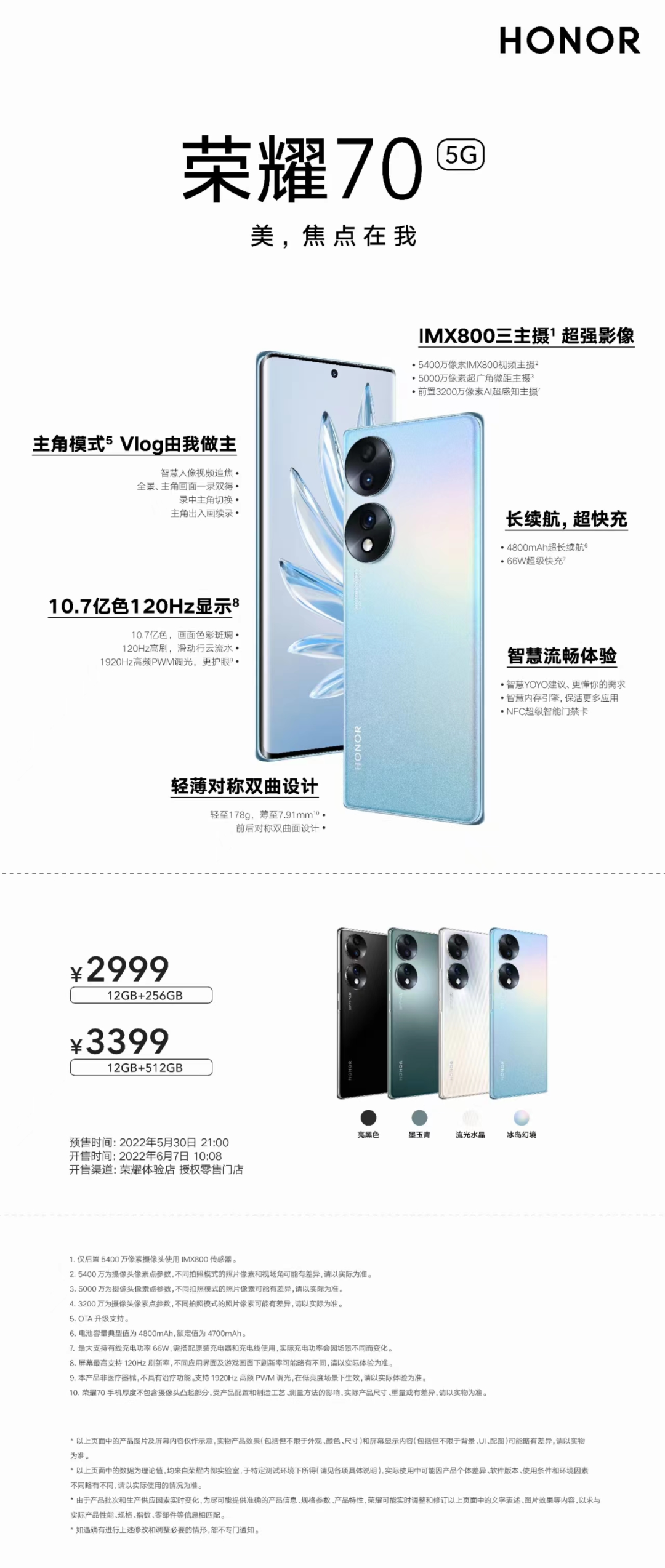 以光影绘绝色,双镜设计,简练纯粹;超级双曲屏与对称双曲设计,线条温润,上手服帖;IMX800大底视频主摄,Vlog主角模式,顺光逆光,超广角微距,凭实力成就主角光环;4800mAh超大电池,66W超级快充,告别续航焦虑的荣耀70,6月7日已全渠道火热开售,12GB+256GB大内存版本2999元起,欢迎登陆荣耀商城及各大授权电商平台或前往荣耀线下门店下单体验。