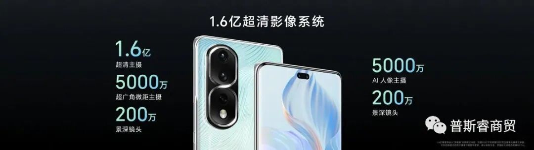荣耀80系列后置首发1.6亿像素超清主摄,普通拍摄模式下,凭借十六像素合一技术可实现2.24μm的等效像素尺寸,带来高像素、高感光、高动态范围影像效果;还有5000万像素的超广角微距主摄,支持122°取景范围,在普通拍摄模式下不仅支持AI自动切换至超级微距模式,更新增支持在普通录像模式下AI自动切换至微距录像模式,当逐渐靠近被拍摄物体12厘米以内时自动触发,对焦距离可以贴近至2.5cm,无需手动设置。