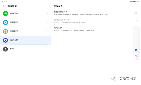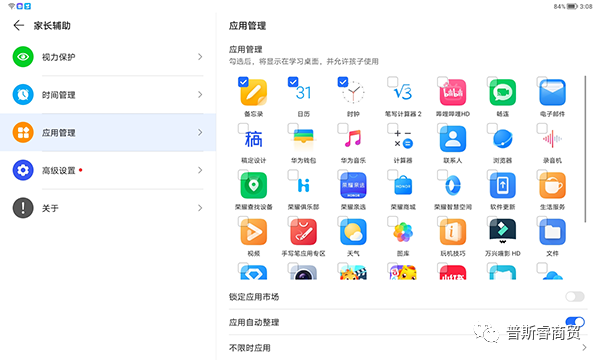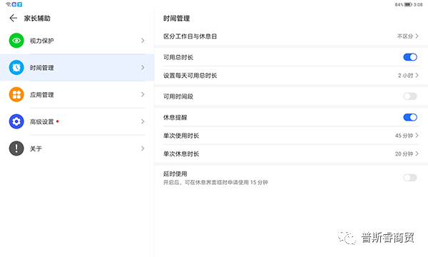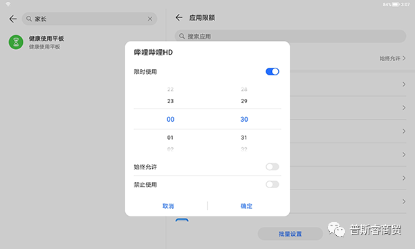 而在家长辅助学习与监督设置方面,荣耀平板8也想到了。比如系统预置里的健康使用平板模式,可以精准管控设备或App的使用。进入菜单选择“孩子使用”后,会出现可用时长、应用限额、停用时间、内容访问限制等细致设定选项。