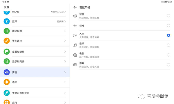 视听体验方面,立体声8扬声器不仅在安卓阵营难有敌手,放到iPad对比也独有优势。比如声音调教可以点击声音菜单,对音质和音效进行个性化定制。尤其是调音,荣耀平板8支持HONOR Histen与DTS双重调音,以及游戏、音乐、电影等各种使用风格匹配。