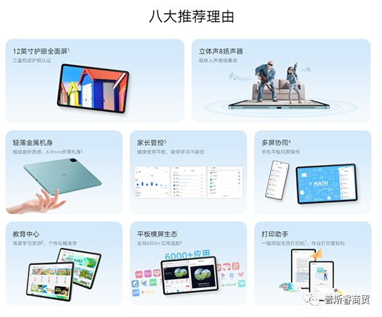 据官网介绍,荣耀平板8涉及护眼认证、立体声8扬声器、轻薄机身、家长管控、多屏协同、教育中心以及平板生态和打印助手八个卖点。