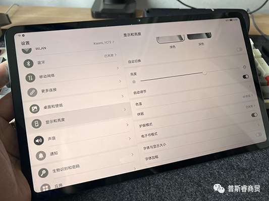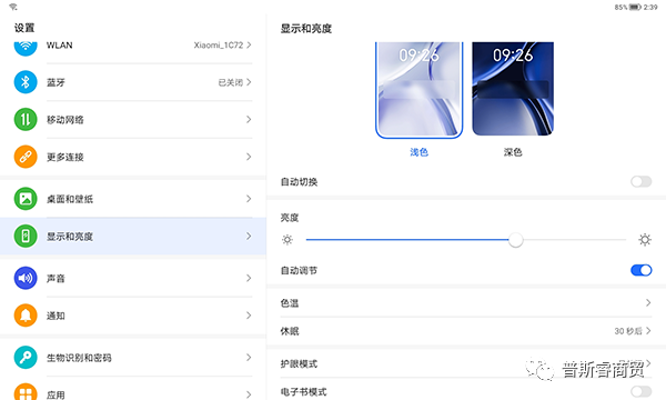 首先是护眼认证,荣耀平板8获得了莱茵硬件级低蓝光认证等三项国内外权威机构认证,提供了深色、护眼、电子书三种屏显模式可供选择。开启方式需点击显示和亮度,下滑菜单即可找到对应调节入口。
