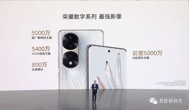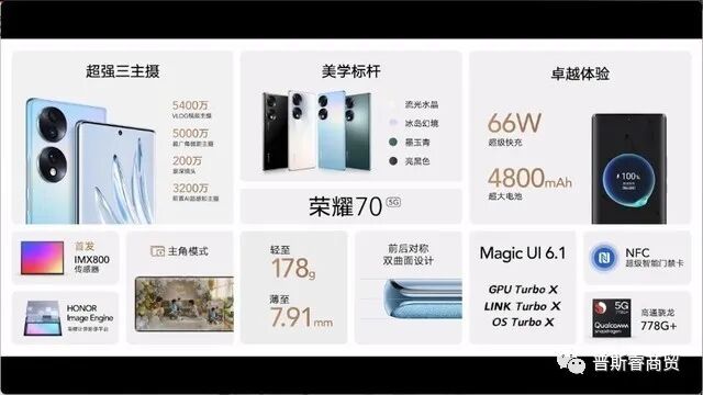 随后亮相的是荣耀70,其机身仅重178g,薄至7.91mm,机身后摄模组同样首发IMX800 5400万像素vlog视频主摄,搭载骁龙778G+芯片,支持4800mAh电池+66W超级快充。