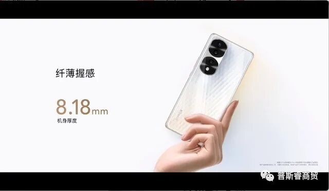 荣耀70 Pro采用了业界首个全对称四曲面设计,机身转角处优雅圆润,机身厚度仅有8.18mm。该机的后摄模组设计非常独特,具有荣耀标志性的风格,拿在手里在不同的光影照射下变幻万千。