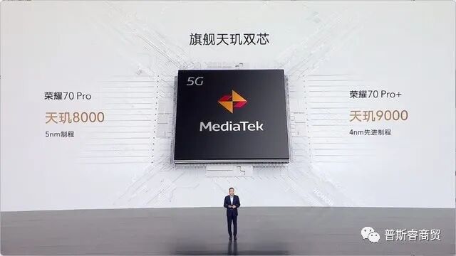 随后,赵明向用户们介绍了荣耀70 Pro系列的性能:荣耀70 Pro搭载天玑8000芯片、Pro+搭载天玑9000芯片,支持100W快充,30分钟极速充满。
