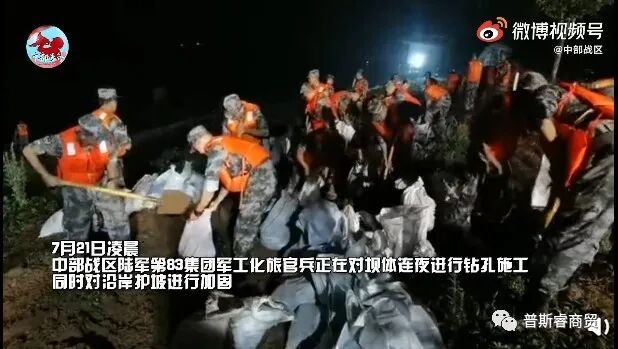 21日凌晨,中部战区陆军第83集团军工化旅官兵对坝体连夜进行钻孔施工,同时对沿岸护坡进行加固。视频截图