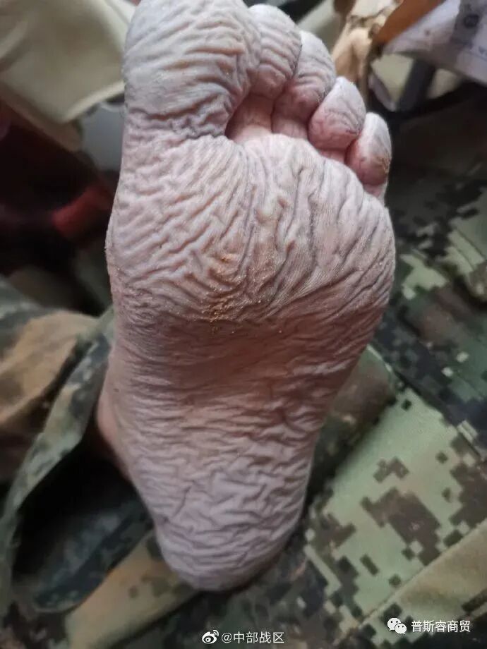 因为长时间的救援,泡在水中的双脚也已发白起皱……